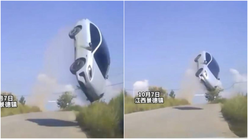 2025年10月7日,江西景德镇一轿车突飞起4米高。(网络视频截图)