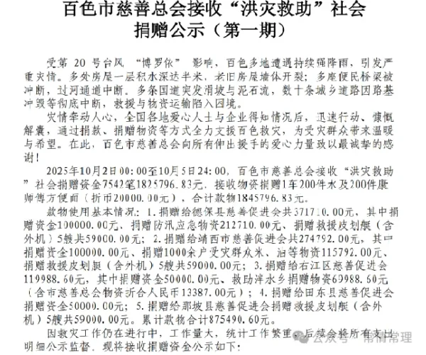 9月底至10月上旬,台风“博罗依”与“麦德姆”(Matmo)先后袭击广西,多地遭洪水淹没,灾情严重。10月6日,百色市慈善总会发布《社会救助捐赠公示(第一期)》公布募捐情况。此次公开的七千五百多笔捐赠,主要针对台风“博罗依”造成的百色地区灾情。该台风期间广西多地出现持续强降雨,导致房屋浸水、桥梁冲断及道路滑坡等灾害。