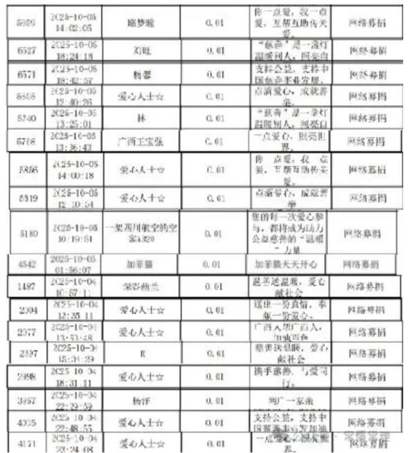 广西在台风“博罗依”(Bualoi)过境后,百色慈善总会公布的捐款明细中出现数十笔仅有0.01元(一分钱),也有0.02元、0.1元等“极小额”捐赠,引发民间热议。有评论指出,一分钱虽少,却象征性地传达了一种抗议,是对不透明慈善管理机制的不满。