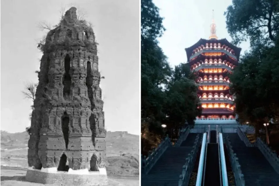 雷峰塔,始建于北宋太平兴国二年(977年),原名皇妃塔,北宋宣和二年(1120)年被毁,南宋重建,明嘉靖年间仅剩砖塔结构,民国十三年(1924年)九月二十五日,雷峰塔因塔砖盗挖过多、塔址附近汪庄造屋打桩引起震动而倒坍。