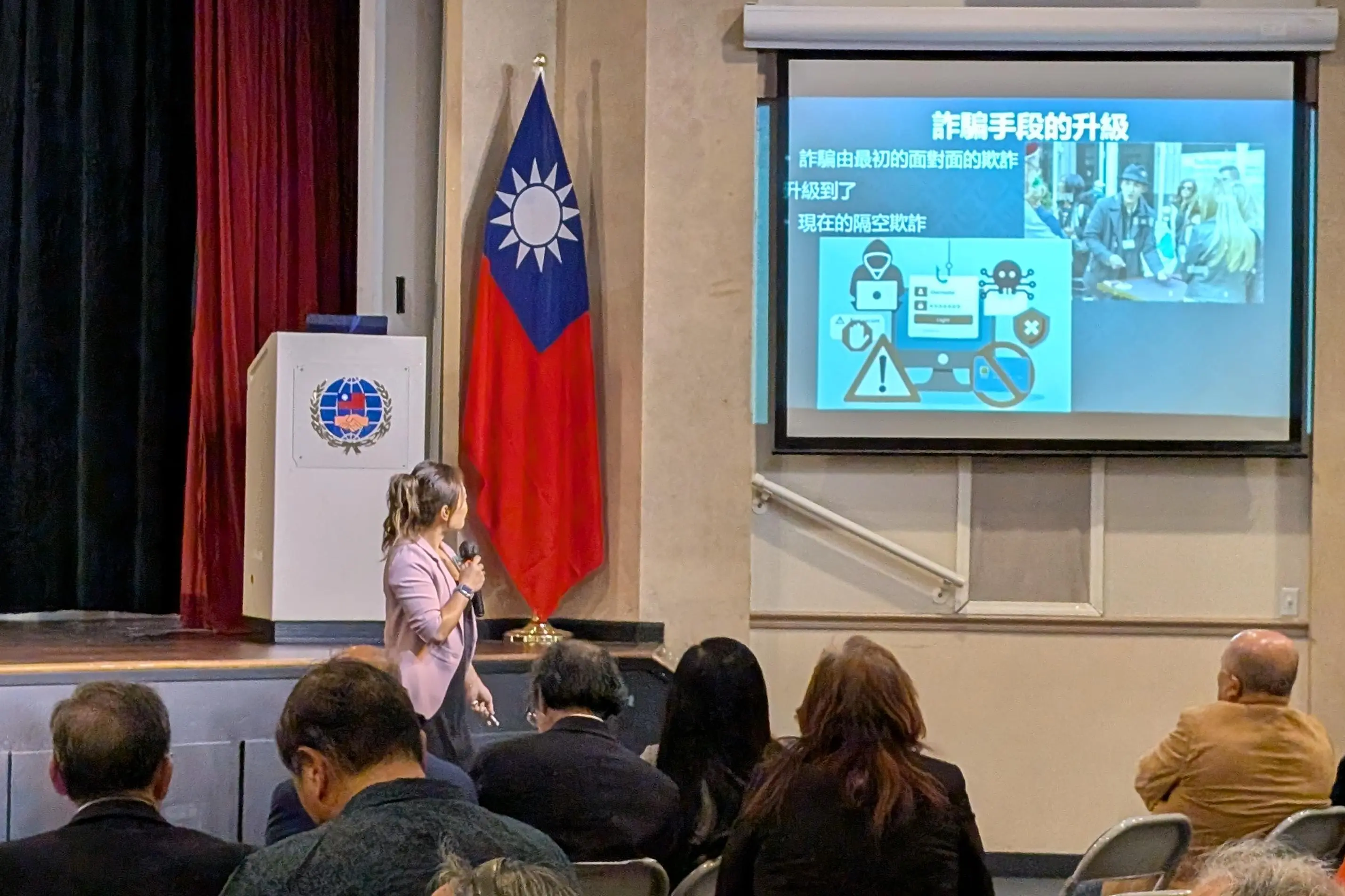 为协助社区民众提高警觉,洛杉矶县警局诈欺与网路犯罪调查局警探鲍德温(Aily Baldwin)于10月4日(周六)在洛侨中心演讲,分享如何有效防范各类猖獗的诈骗手法,特别是针对长者族群的投资与AI科技诈骗。