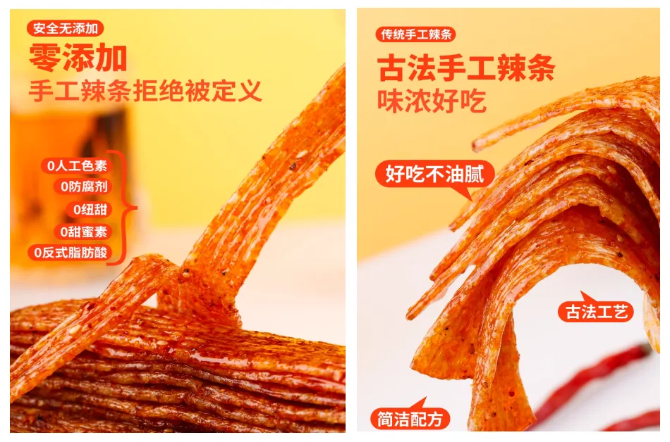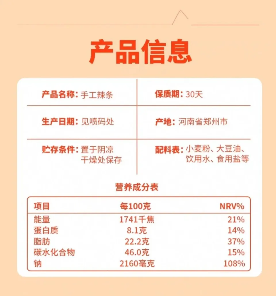 2号食品,某款主打“零添加”的辣条。它宣称不含人工色素和防腐剂,甚至采用了许多商家乐于宣传的“传统手工古法”制作。翻看它的【配料表】也确实非常“干净”,只有小麦粉、大豆油、饮用水、食用盐等常见材料。很多人看到这里,可能就放下了警惕,觉得它至少要比巧克力威化饼干健康一些。