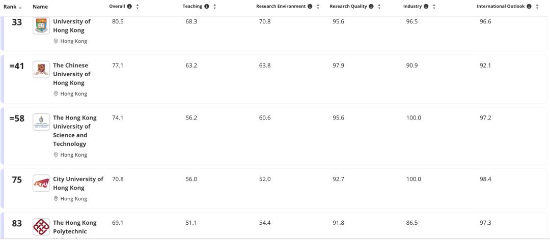 5所中国香港院校进入全球前100名:香港大学(33)、香港中文大学(41)、香港科技大学(58)、香港城市大学(75)、香港理工大学(83)。