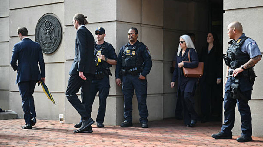 2025年10月8日,在弗吉尼亚州亚历山大市,前联邦调查局局长詹姆斯·科米的妻子帕特里斯·费勒(戴墨镜)及其家人在科米接受提审听证会后离开阿尔伯特·V·布莱恩美国法院。(ANDREW CABALLERO-REYNOLDS/AFP via Getty Images)
