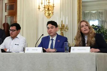 2025年10月8日,布兰迪·克鲁斯(Brandi Kruse,右)与安迪·阮(Andy Ngo,中)在白宫国宴厅参加圆桌会议发言。(Anna Moneymaker/Getty Images)