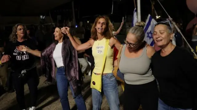 以色列人质的家属庆贺停火协议到来,希望他们的亲友归来。图像来源,Reuters