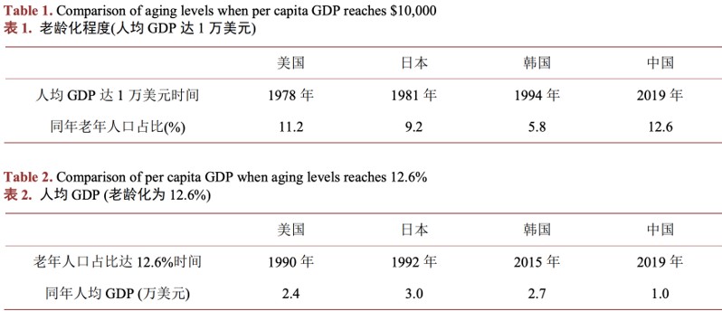 一是“未富先老”。发达国家一般在人均GDP为5,000—10,000美元时,自然进入老龄化社会,如美国1950年60岁以上人口占12.5%,人均GDP为10645美元。中国呢?2000年人均GDP不到1,000美元,就开始了轻度老龄化,没富就老了起来。而中国的邻居——日本、韩国,老龄化水平达到7%时,人均GDP分别为1,685美元、12,257美元。进入中度老龄化时,美国、日本、韩国人均GDP分别为5.5万美元、4万美元、3.3万美元,中国只有12,618美元(2021年)。联合国人口司数据(见下表)表明,中国的人口老年化进程大大超越了中国的经济发展极端。中共当初搞计划生育、强制一胎化,声称是为发展经济,结果却祸害了中国经济。