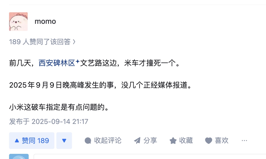 还有一西安网友透露,前几天,在西安碑林区文艺路这边,“米车才撞死一个。2025年9月9日晚高峰发生的事,没几个正经媒体报道。小米这破车指定是有点问题的”。