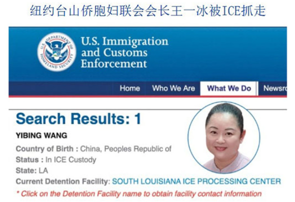dajiyuan:中秋前夕,布碌仑八大道侨界传出消息:台山侨胞妇女联合会会长王一冰被美国ICE逮捕,现被拘押于路易斯安那州。律师称案情混乱,正等待进一步消息。传王一冰涉假结婚,两年前还被FBI盘问与纽约中领馆的关系。