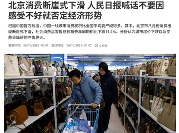 RFI_Cn:北京市八月份消费出现断崖式下滑,社会消费品零售总额与去年同期相比下跌11.4%。分析认为城市房价下跌以及受裁员降薪的冲击更大。根据中共官方数据,中国一线城市消费状况比全国平均要严峻得多。