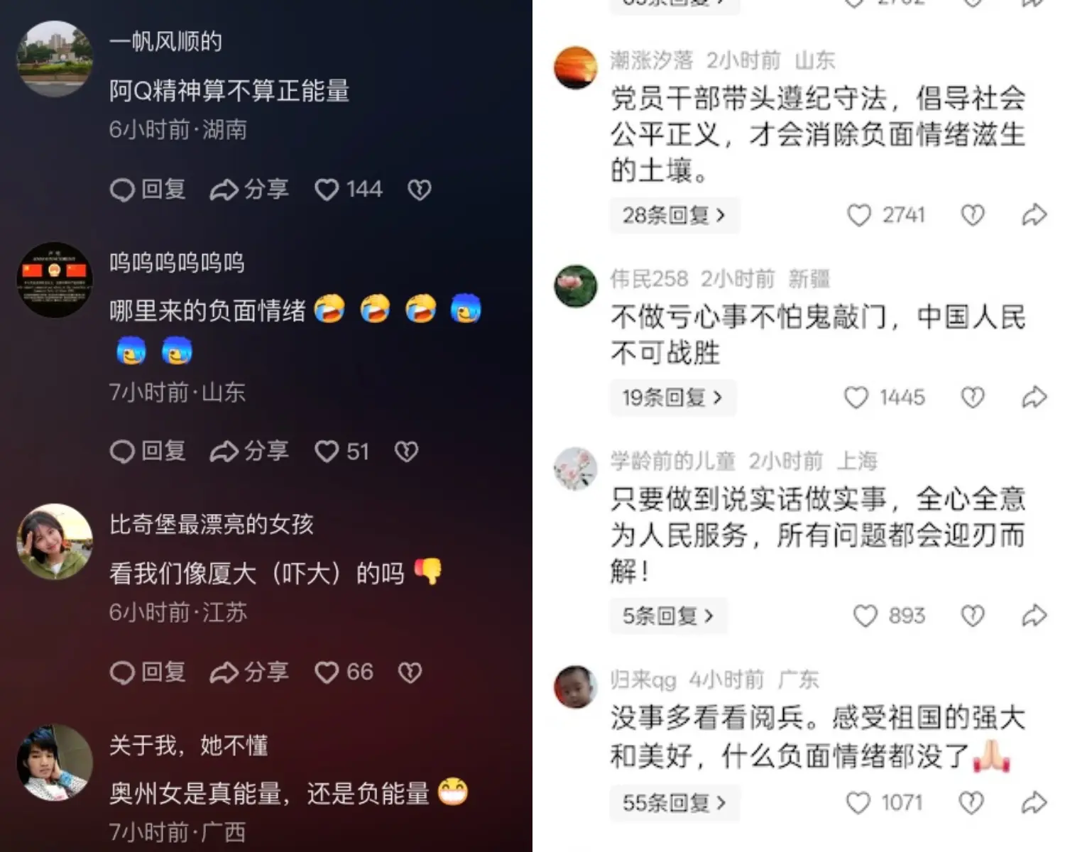 网友纷纷质问:“先要问下,为何这么多人有负面情绪呢?”“正人先正己,​负面情绪的源头是哪?”“实话实说,本地受灾情况,被当地媒体直接删除怎么说?”“不管正面情绪还是负面情绪,那都是老百姓切身自己体会的。哦,那是那是人挑动的吗?”“城乡养老差距这算事实还是别有用心?”“奥州女(杨兰兰)是真能量,还是负能量?”“恶意讨薪,恶意回家,是不是挑动负面情绪?先把这些人大代表和专家办了呗”。
