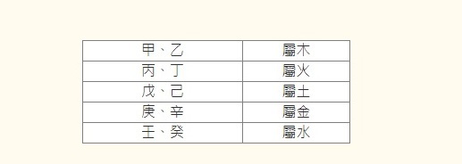 比如上例中,日干为“壬”,通过查表得出壬属水,则五行为水(如下表所示)。