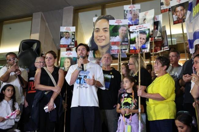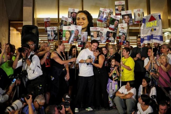 在以色列特拉维夫的人质广场,当川普总统宣布以色列与哈玛斯达成加萨和平计划的第一阶段协议后,民众聚集庆祝。曾于今年2月自哈玛斯囚禁中获释的前人质谢姆托夫(Omer Shem Tov)也现身发表谈话。(欧新社)