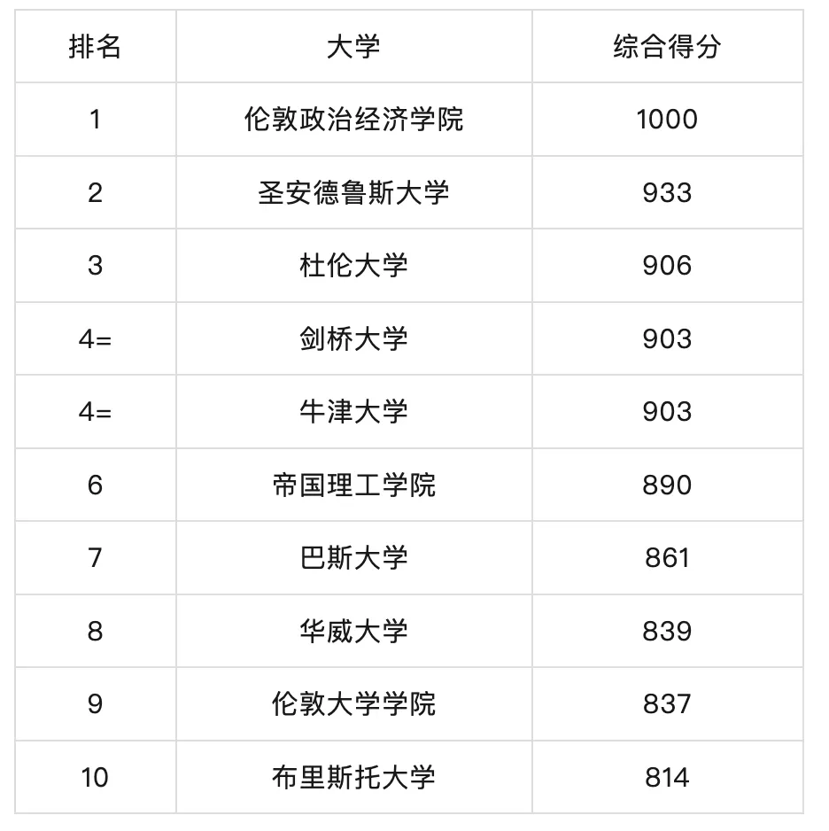 在最新排名中,伦敦政治经济学院(LSE)连续第二年蝉联榜首;圣安德鲁斯大学凭借学生满意度优势位列第二;杜伦大学则首次跻身前三。牛津与剑桥并列第四。