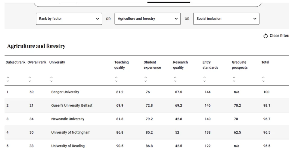 一些整体排名一般的大学,往往能在特定学科中脱颖而出。例如:名不经传的班戈大学在农业与林业领域位列全英第一,尽管总体排名仅第59位,却超越了贝尔法斯特女王大学与纽卡斯尔大学;经济学排名第一的华威大学则位列第八,力压牛津与剑桥。
