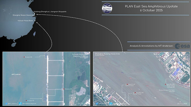 据《新闻周刊》报导,根据欧洲太空总署(ESA)10月6日拍摄的 Sentinel-2卫星影像,至少三型中共海军主力两栖舰艇出现在上海长江入海口一带。开源防卫分析师安德森(M.T. Anderson)指出,画面中可见一艘“玉昭级”(071型)登陆舰,排水量约2万5千吨,能搭载登陆艇、装甲车及数百名士兵,属于中共军队两栖作战的中坚战力。