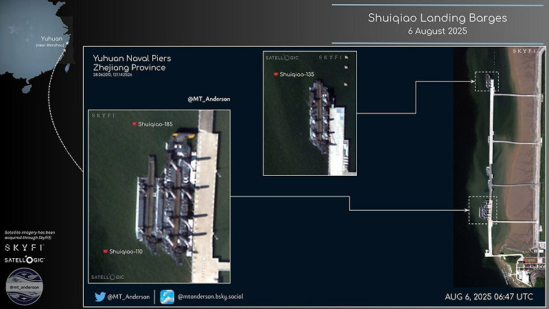 《新闻周刊》报导中也提到,另外一份卫星影像则显示,在距离上海约270英里(约435公里)的浙江玉环海军基地,可见三艘新型“水桥级”登陆运输驳船。这型舰艇名称取自“水上桥梁”,船首设有可延伸约120米的活动甲板坡道,能让坦克与卡车直接驶上沿岸公路,突破传统登陆受地形限制的问题。