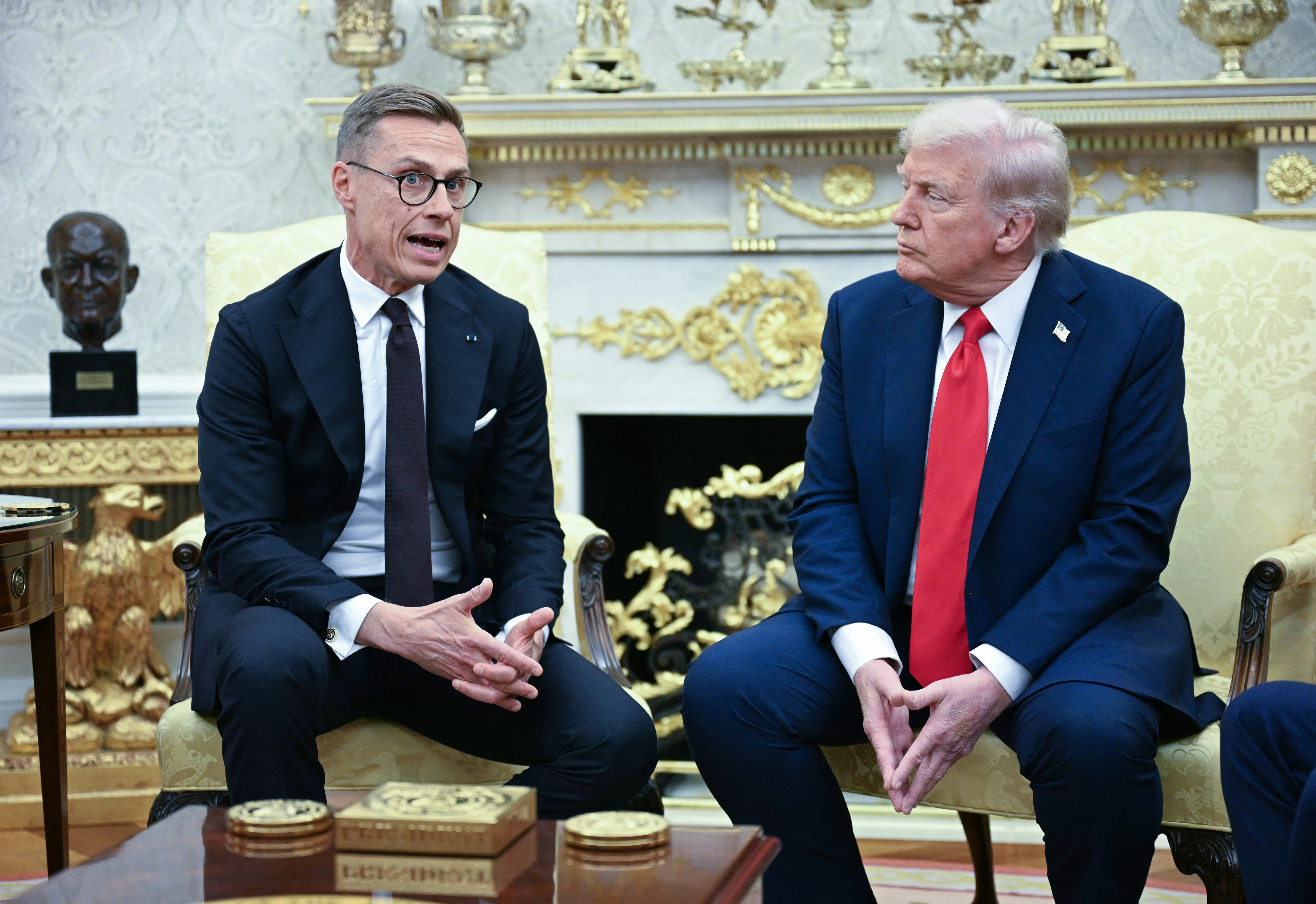 2025年10月9日,美国总统唐纳德·川普(特朗普)在华盛顿白宫椭圆形办公室会见芬兰总统亚历山大·斯塔布(Alexander Stubb)。(Jim Watson/AFP/Getty Images)