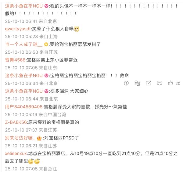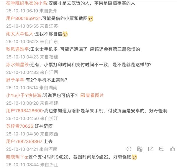 有人研究了她发布的手机截图,发现聊天截图是用苹果手机,而酒店的付费账单却是用一只双卡双待的华为手机截图。网民因此质疑,那张付费账单很可能是其他人当晚在宝格丽消费的记录。