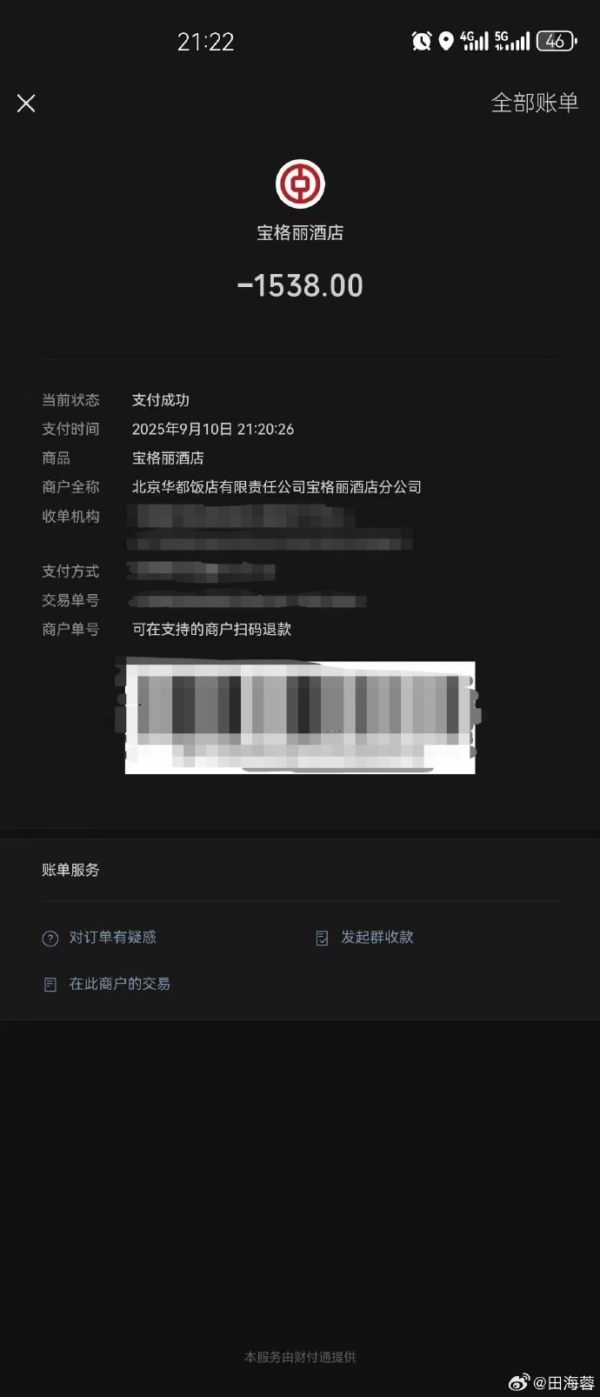 田海蓉公布的酒店消费小票和支付记录。(田海蓉微博)