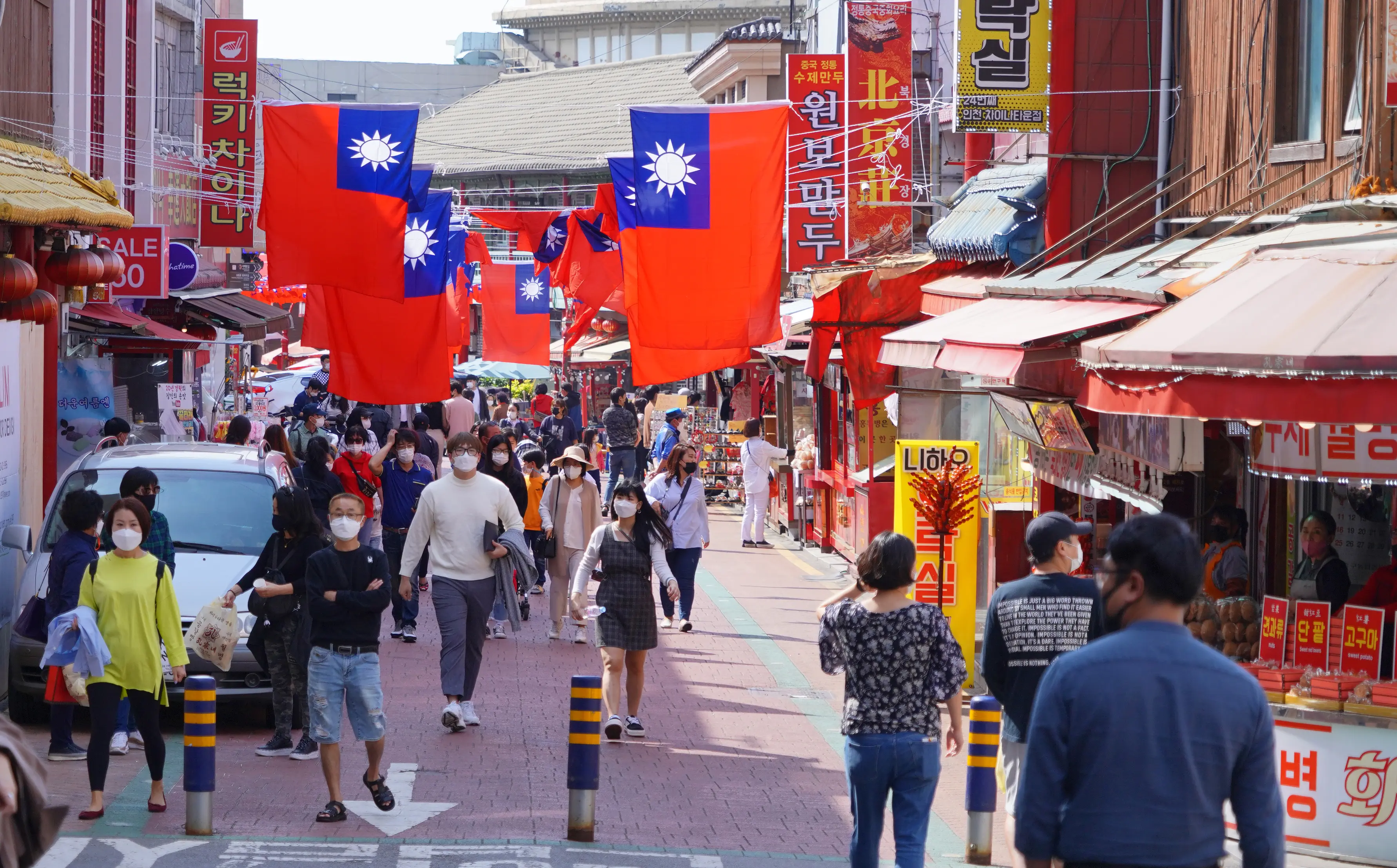 2020年,台湾旅韩华侨在仁川中华街一带举行“国旗飘扬,四海归心”庆祝双十国庆活动,街道上飘满中华民国国旗。(李裕贞/大.纪.元;)