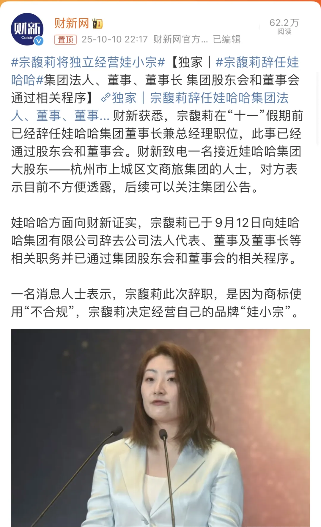 这意味着,她正式告别了父亲宗庆后打造的商业帝国,选择自己再造传奇。