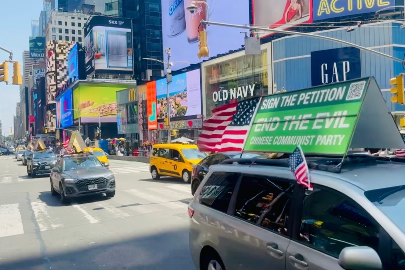 2025年7月6日,纽约真相车队车游行经世界知名的曼哈顿时代广场。(王丽飞/大.纪.元;)