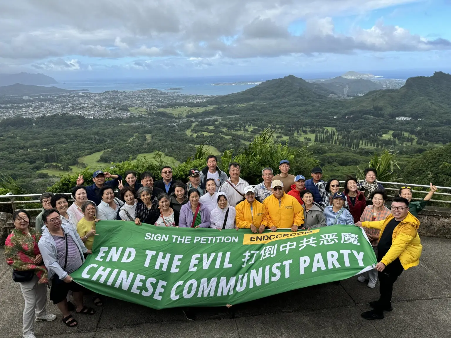 End CCP车队到达他们行程的第50个州——夏威夷,在著名的努阿努帕里观景台(Nuuanu Pali Lookout)展示“打倒中共恶魔”(End CCP)标语。(退!党!中心提供)