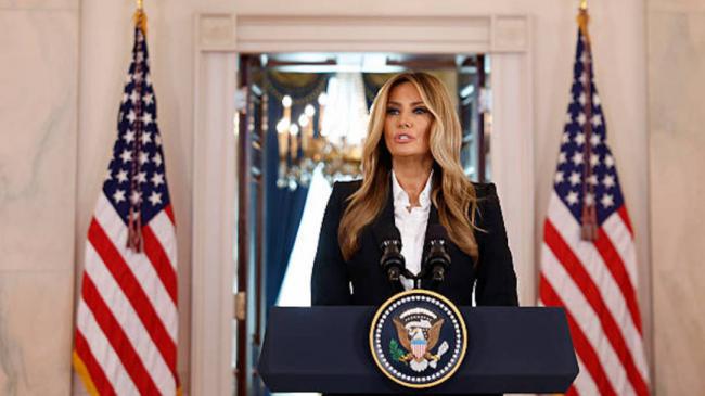 第一夫人梅拉尼娅·川普于2025年10月10日在华盛顿特区白宫大厅发表演说。第一夫人宣布,她与俄罗斯总统弗拉基米尔·普京已建立“开放的沟通管道”,以帮助因俄乌战争而流离失所的乌克兰儿童与家人团聚。(Kevin Dietsch/Getty Images)