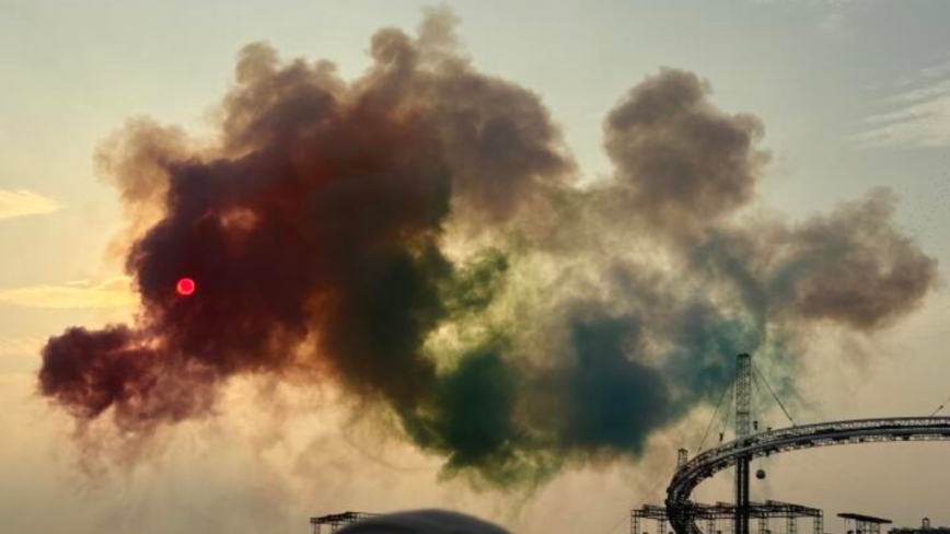 华晨宇南京演唱会上演盛大烟花秀,无人机释放烟花后的彩烟幻化为龙形,太阳化为龙眼。(网络图)