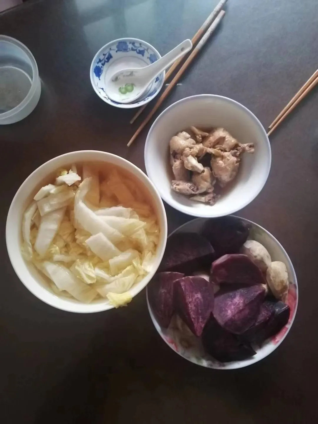 两个老人的生活是很简单的。早上四点半,我先起床,烧开水,要烧三壶,一壶做凉开水,同时洗脸刷牙,简单做一些健身活动舒展身体。父亲起床后他做早饭,一般是红薯、南瓜配上他自己做的凉拌萝卜丝,最近他新做了一罐鸡肉松。