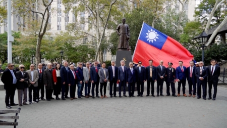 2025年10月10日,纽约中华公所举办中华民国114年双十国庆庆祝活动,图为中华公所主席朱超然(右九)和纽约经文处处长李志强(右十)等人在中山广场向国父孙中山铜像献花后留念。(新!唐!人:电视台)