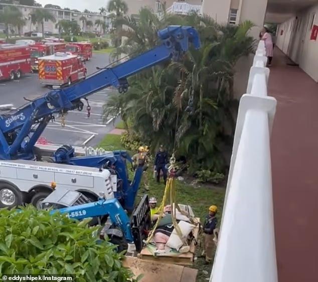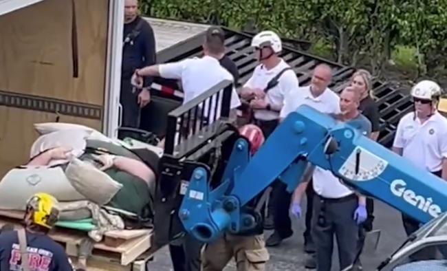 起重机操作人员将其固定在一个木制托盘上,整个托盘被从约20英尺(约6.1米)的高处缓缓下降至地面。然后起重机把托盘带人一起送进小货车车厢,之后拉着他前往医院接受治疗。