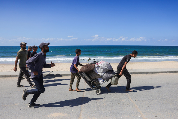 2025年10月10日,巴勒斯坦人从加沙地带中部的努塞拉特沿着拉希德路前往加沙市。(BASHAR TALEB/AFP via Getty Images)