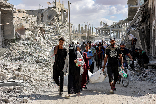 2025年10月10日,在加沙地带南部汗尤尼斯市中心,人们沿着一条被毁的道路行走。(OMAR AL-QATTAA/AFP via Getty Images)