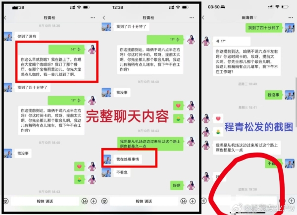 程青松在回应田海蓉时,又刻意强调聊天截图中的19:36这个时间点,不得不令人怀疑可能别有用意。