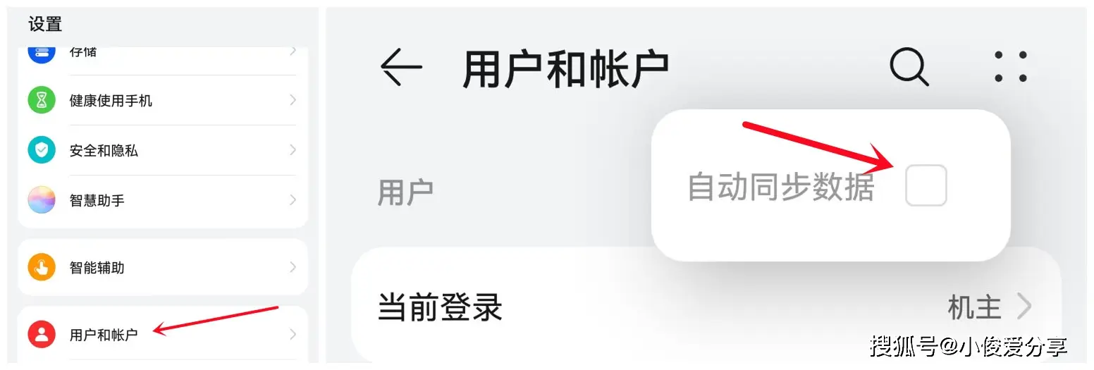 咱们打开手机设置,然后找到用户和账户设置,接着把【自动同步】开关关掉就可以了!