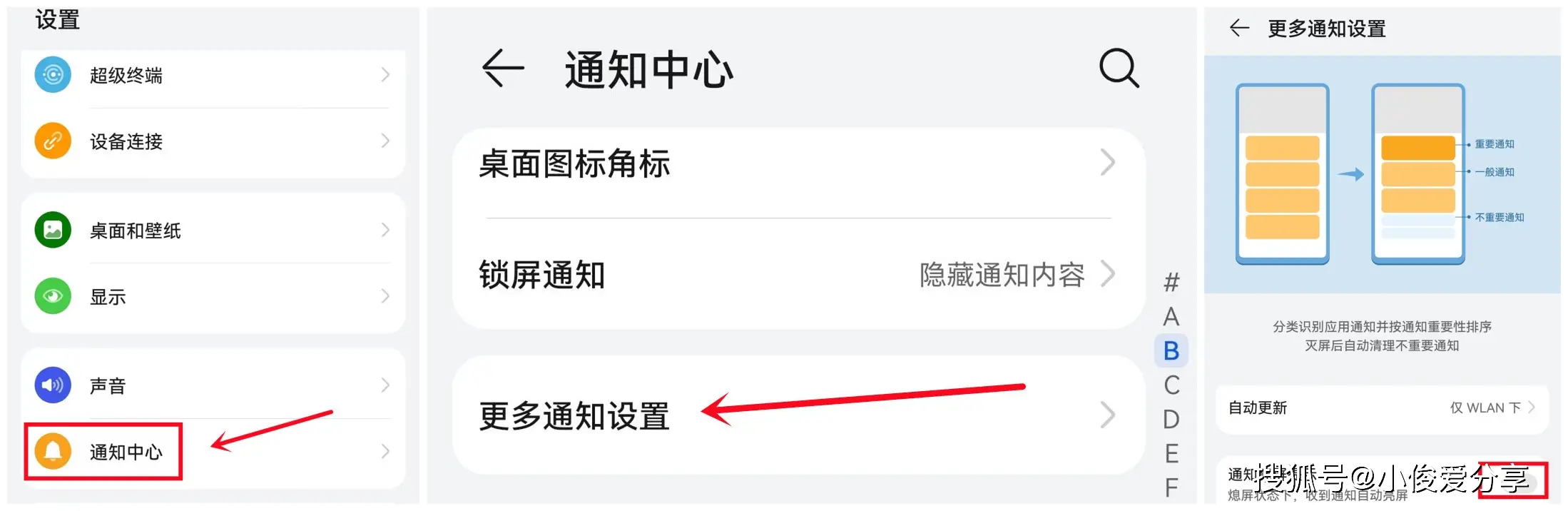 大家发现没有,咱们的手机只要收到了应用发来的通知或者消息,屏幕就会自动亮起,这不仅会缩短屏幕使用寿命,而且频繁亮起屏幕,也是电量消耗大户之一,因此,咱们也需要把这个功能开关关掉!怎么关闭呢?