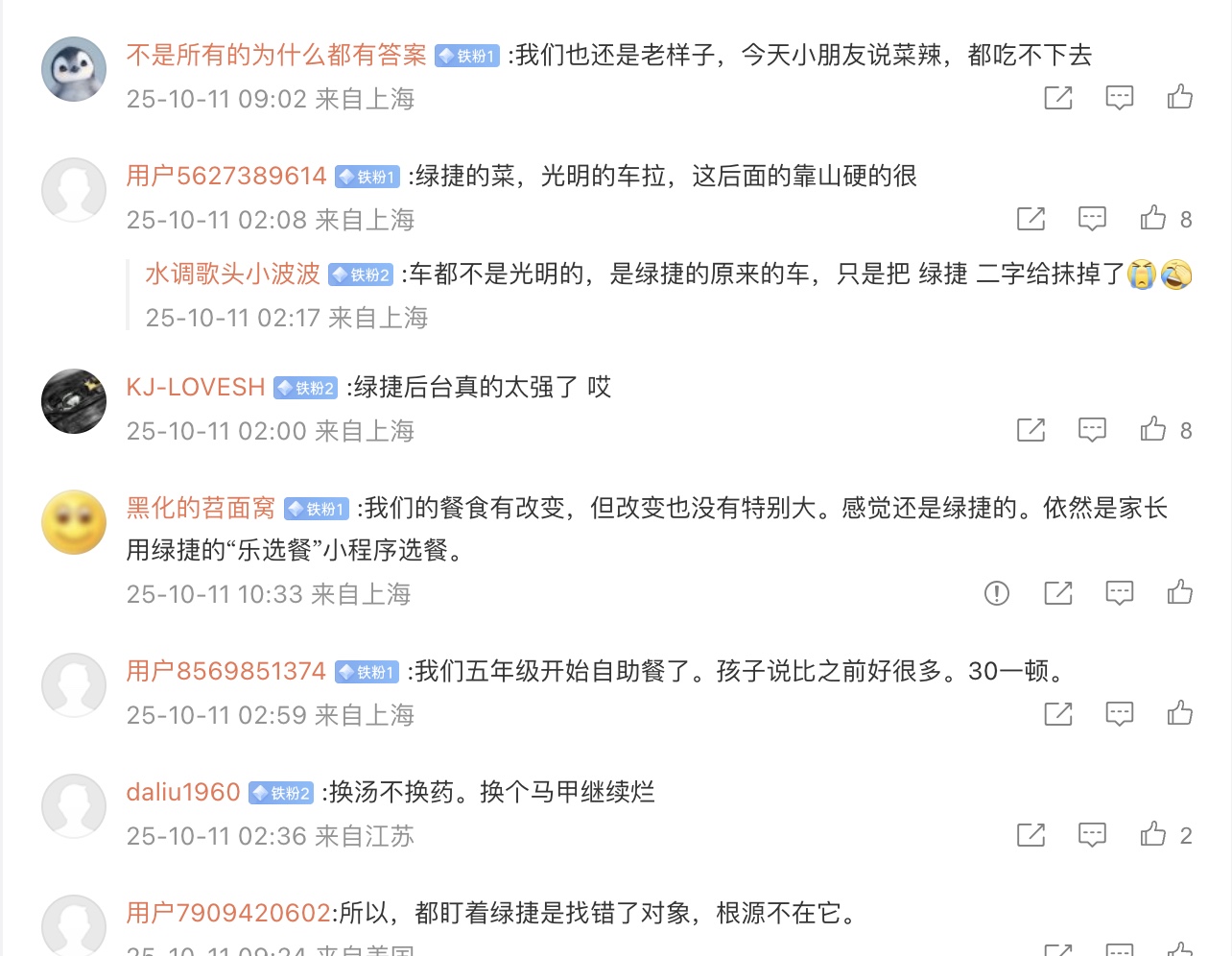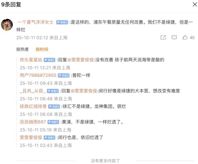 在评论区,上海各个区,包括黄浦区、闵行区、普陀区、徐汇区、长宁区、静安区及青浦区等家长纷纷留言,称午餐质量无任何改善,即使不是绿捷公司供应,质量也是一样低劣:“没有改变”“我们不是绿捷,但是一样烂”“没有改善,孩子前两天说海带是酸的”“闵行也是,依旧烂透了”“黄浦,不是绿捷,一样烂透了”“徐汇不是绿捷。龙神集团。很烂”“青浦也一样,并没有任何变化”“和以前一模一样,坐标长宁区初中”。