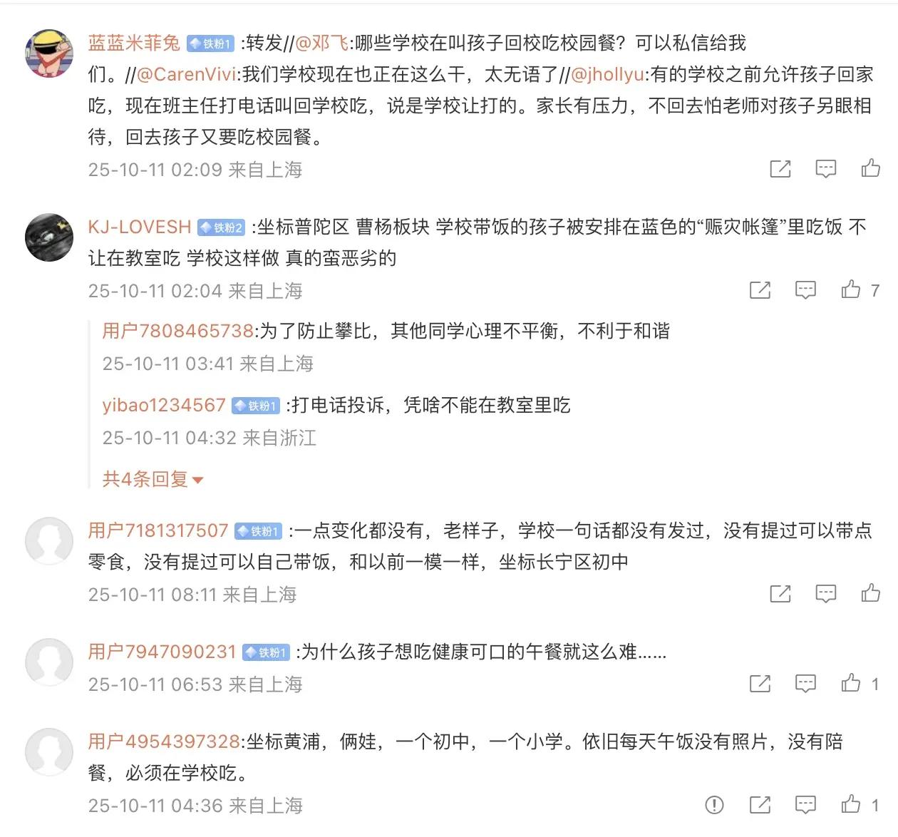 10月11日,一直关注学生餐的大陆前调查记者邓飞在微博发帖询问上海家长:“今天,2025年10月11日,上海校园餐的孩子们吃得怎么样?”
