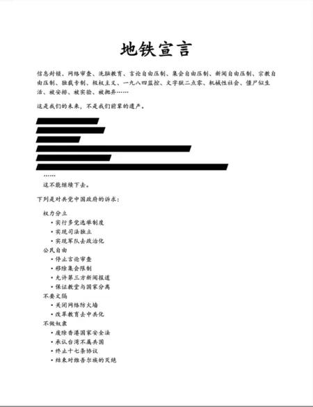 2022年的白纸革命给陈邦超带来启发,他认为运动缺乏明确方向:“我感觉那张白纸应该是填写什么上去比较好一点,那我开始就在疫情刚开放的时候,2022年12月左右,开始制作地铁宣言。”这份宣言由他一人创作,涵盖教育改革、拆除防火墙、司法独立、新疆人权等诉求。