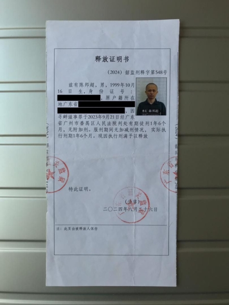 2024年8月陈邦超被刑满释放,在2024年10月至2025年9月间,他至少六次被国保或公安传唤,被警告只能“接触国家批准的媒体,不得翻墙或绕过审查。”2024年9月27日,他尝试续签港澳通行证时,被告知已经被限制出境。2025年9月,他再次申请,被电话通知不允许签注。