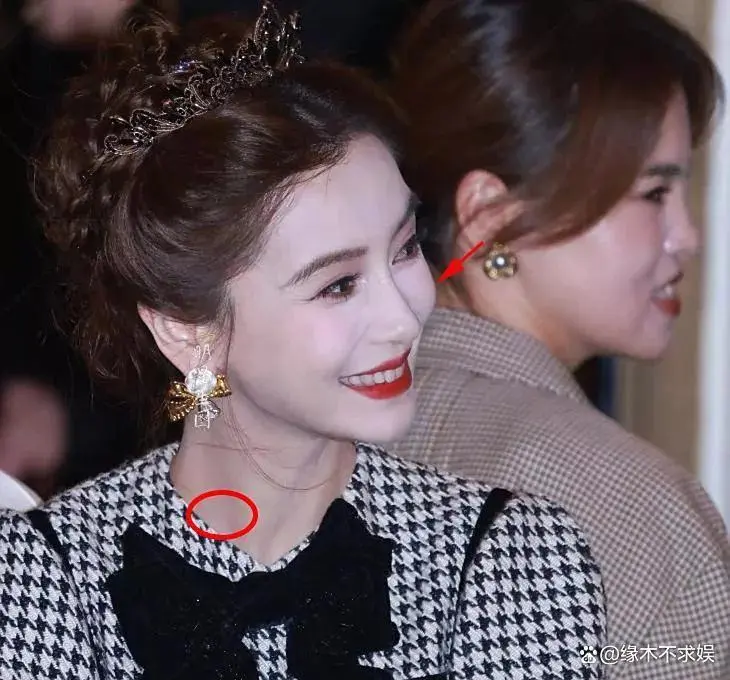 近距离看,Angelababy妆容厚重,尤其眼妆略显凌乱,下睫毛稀疏如“苍蝇腿”,眼影晕染不够精致。面部妆点色块分明,白一块红一块,加上眼角高光,显得有些杂乱。