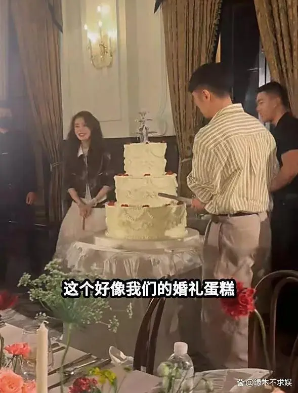 切蛋糕时,她看到三层白色蛋糕感慨道:“这个好像我们的婚礼蛋糕。”