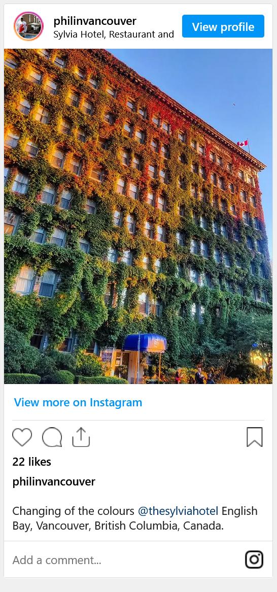 英吉利海湾(English Bay)是大温民众夏季的最爱,但秋季在附近散步的人则是另一种享受,因为Sylvia酒店著名的外墙会从绿色变成五彩斑斓的颜色。