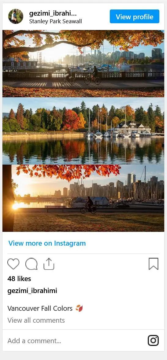 斯坦利公园的海滨步道(Seawall)更是成为一幅绚丽多彩的秋日画卷: