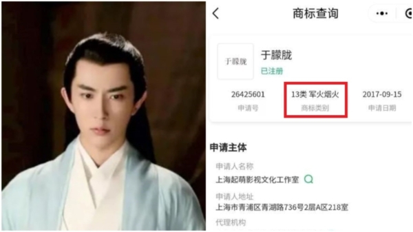 早前,大陆男星于朦胧离奇身亡后,被挖出其名下早在签约天娱不久就注册13类军火商标。