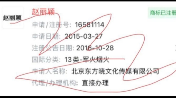 网上传出多个商业查询平台天眼查截图显示,一线明星赵丽颖、黄晓明名下也注册有13号军火商标,甚至台湾的王心凌也被挂名。