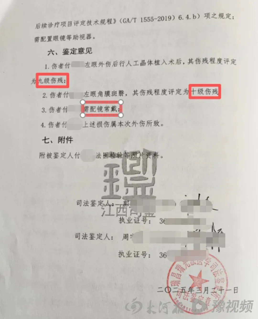 魏女士称,经过两次手术,经历了约4个月的治疗后,于2025年3月5日回家进行康复训练。目前伤残等级被评定为9级与10级共存,孩子左眼植入人工晶体,看近处必须佩戴特殊眼镜,否则看不见近处事物。