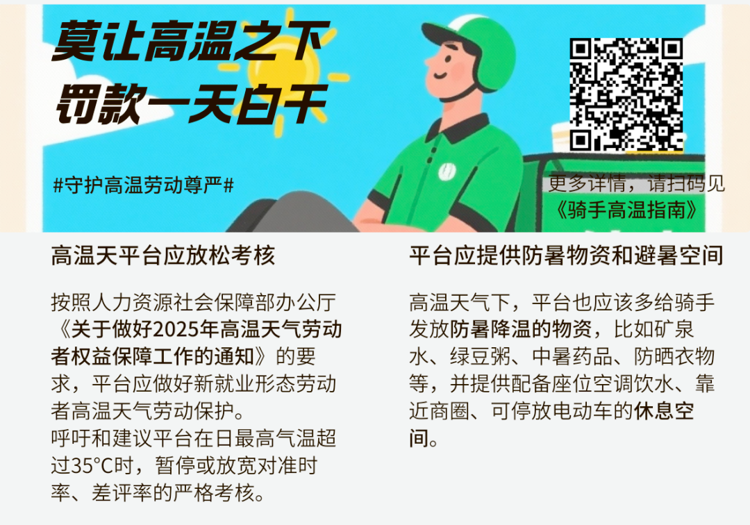 基于调研,同时参考国内和国际上的法律规定和社会共识,文章做出了针对平台、政府、消费者的三方倡议,并提供了一份骑手高温指南工具包,希望可以帮助骑手在获得健康保障的基础上,拿到更多应得的高温收入。高温指南链接